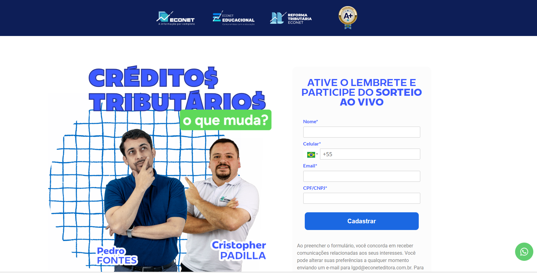 A página divulga uma live gratuita da Econet Editora sobre as novas regras de créditos tributários com a Reforma Tributária. O evento é direcionado a profissionais das áreas fiscal e contábil, abordando os impactos práticos do sistema não cumulativo, os riscos e as oportunidades para as empresas se adaptarem às mudanças na legislação.