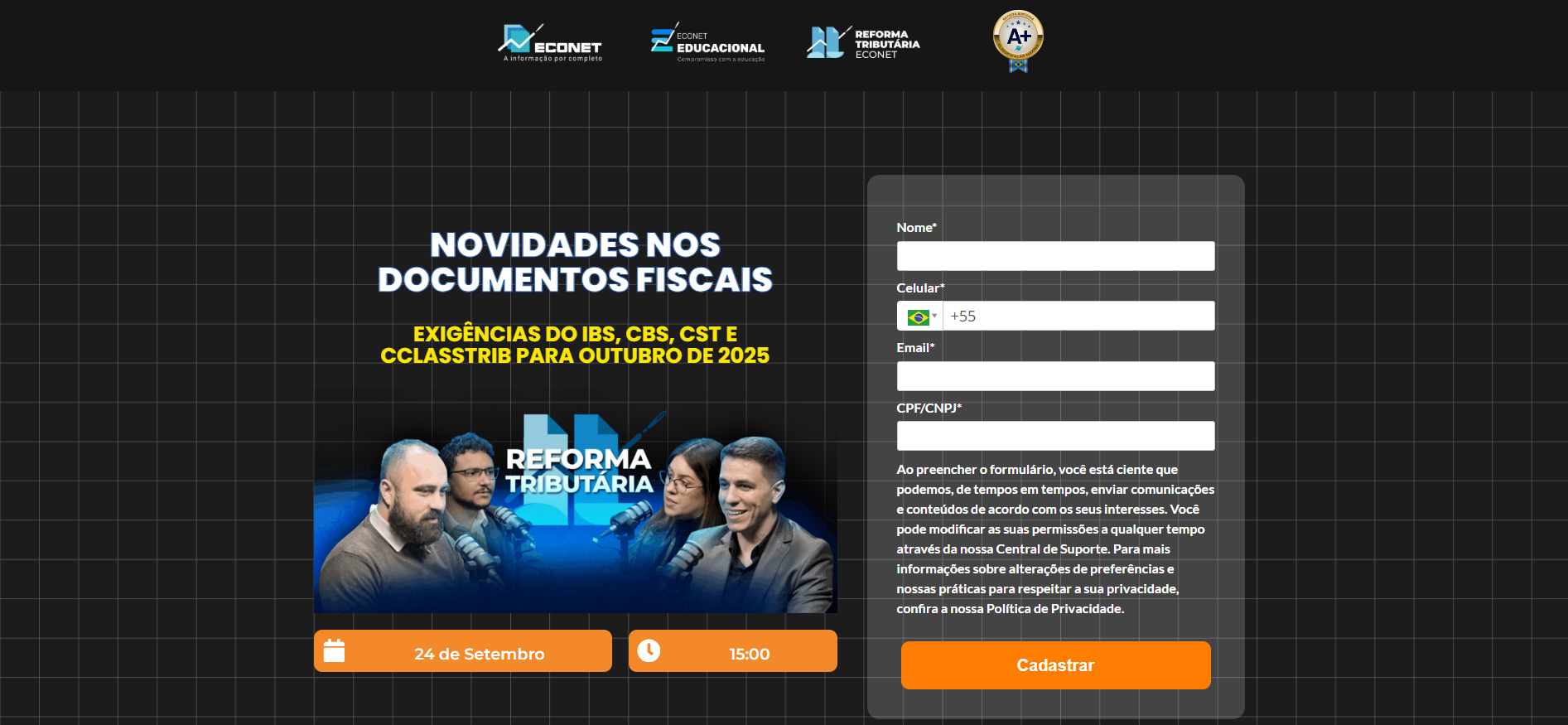 Esta página promove uma live gratuita da Econet Editora focada nas alterações dos documentos fiscais devido à Reforma Tributária. O evento online destina-se a orientar empresas, contadores e desenvolvedores sobre as mudanças práticas no leiaute da NF-e, novos campos obrigatórios e a correta utilização dos códigos para garantir a conformidade com o IBS, CBS e IS.