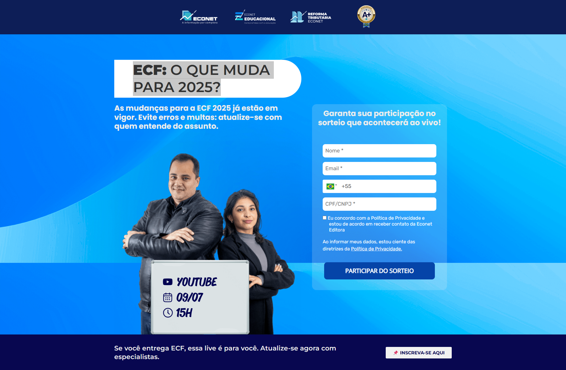 Esta página promove uma live gratuita da Econet Editora sobre as principais mudanças na Escrituração Contábil Fiscal (ECF) para 2025. O evento é voltado para profissionais da área contábil e fiscal, detalhando as atualizações do leiaute, prazos de entrega, novas regras de validação e como evitar erros e penalidades na declaração.