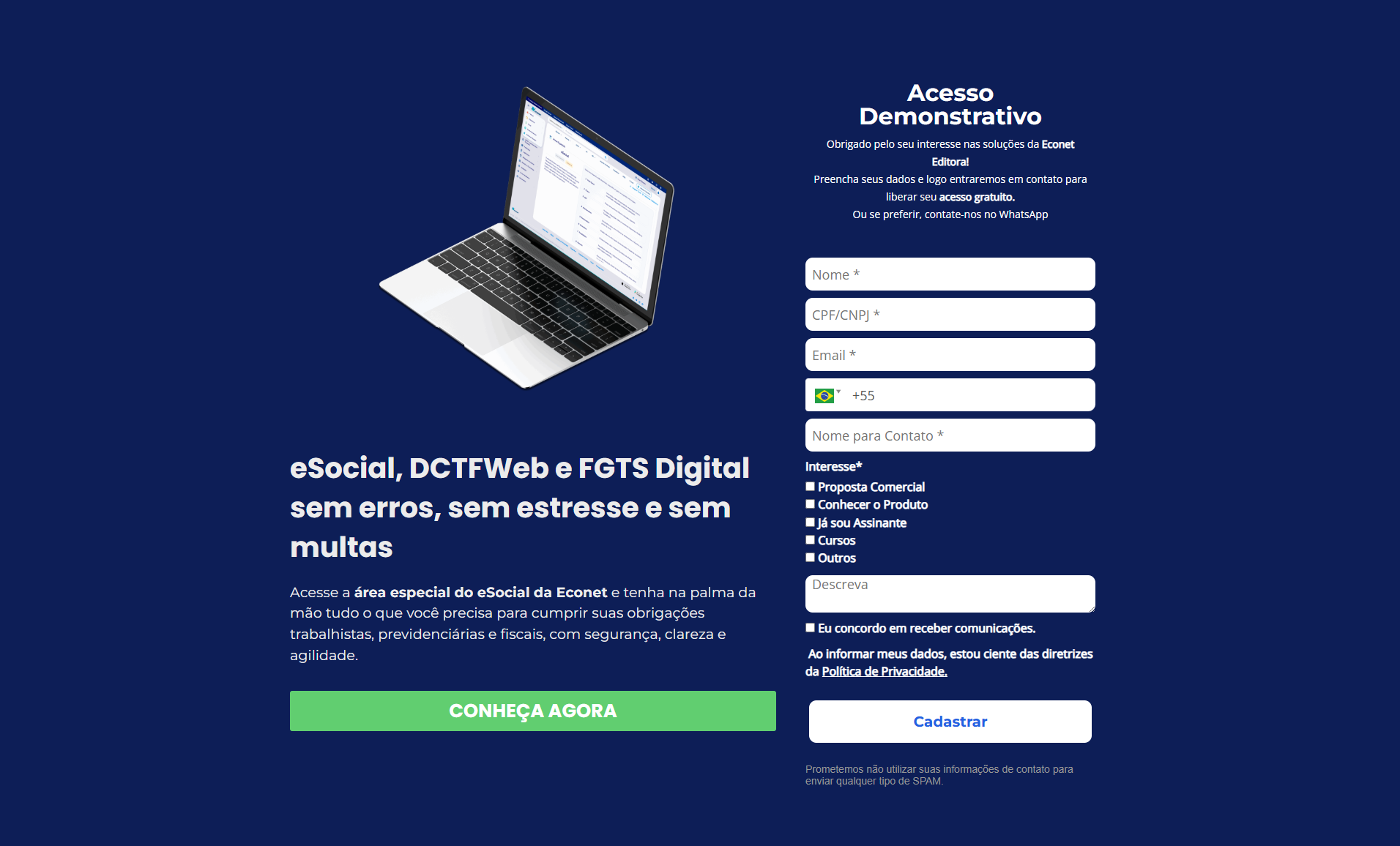 A página da Econet Editora oferece uma área especializada com conteúdo completo e atualizado sobre eSocial, DCTFWeb e FGTS Digital. A solução é voltada para profissionais dos departamentos pessoal, contábil e fiscal, centralizando ferramentas, guias práticos e suporte para simplificar a rotina, garantir a conformidade e evitar multas relacionadas a essas obrigações.