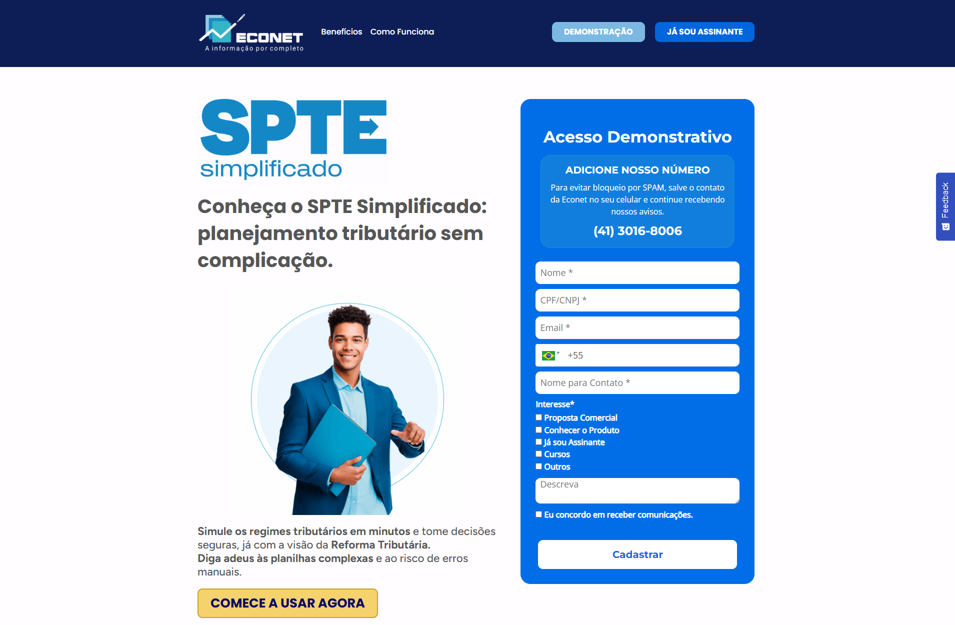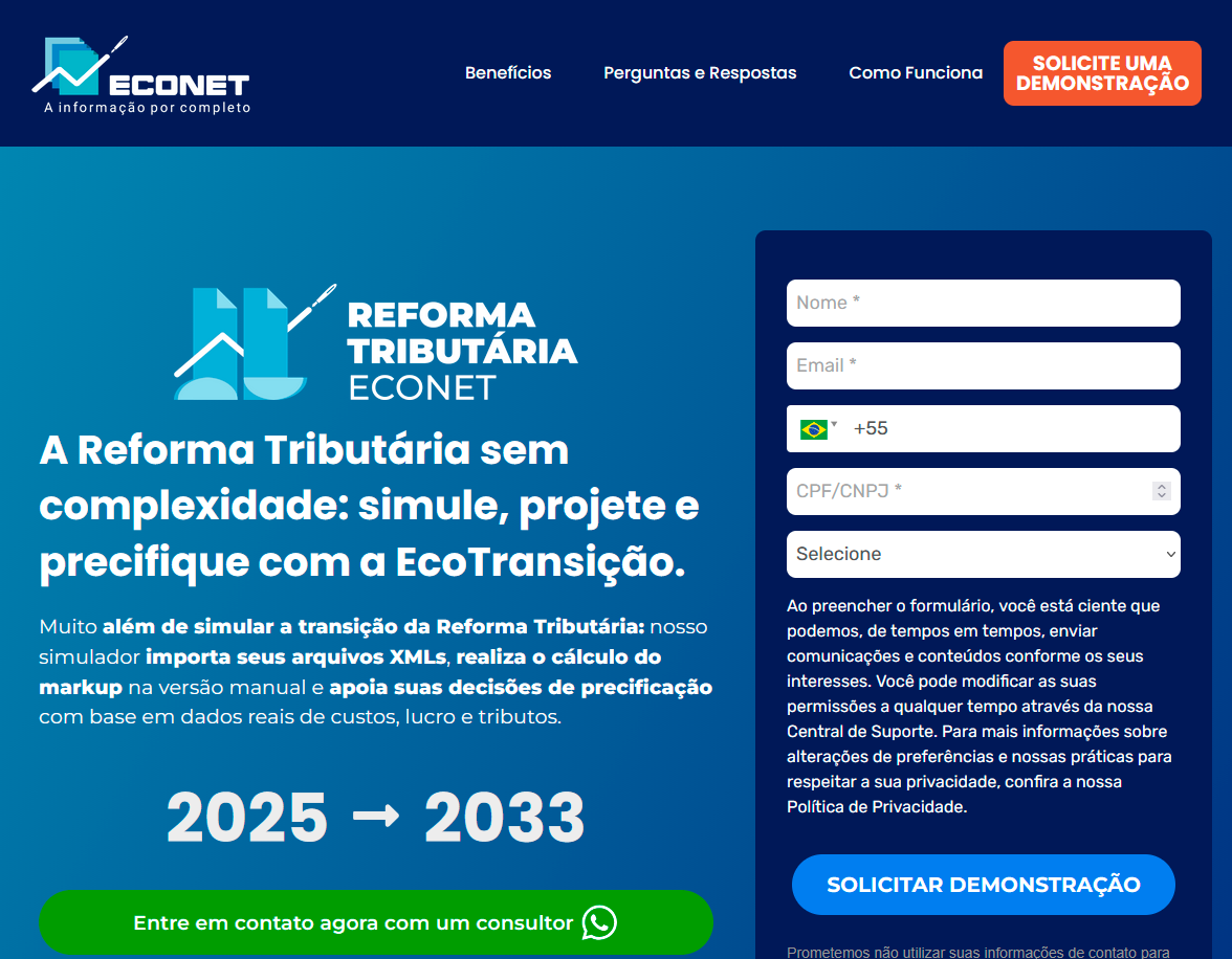 A SPTE Simplificado é uma solução voltada para contadores, gestores e consultores que precisam simplificar o planejamento tributário e tomar decisões rápidas com segurança. Ela permite simular diferentes regimes tributários em minutos, com apenas cerca de 15 campos e geração automática de comparativos visuais — eliminando o uso de planilhas complexas. O sistema já incorpora as alíquotas previstas da futura Reforma Tributária de Consumo (IBS/CBS) e projeta o impacto até 2033. A proposta é dar mais agilidade à prospecção de clientes e oferecer uma visão estratégica atualizada para o futuro tributário, com o respaldo técnico da Econet Editora, referência em consultoria tributária no Brasil.